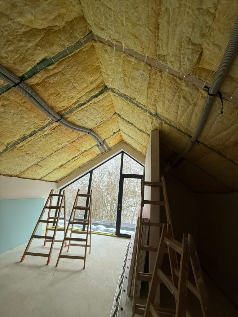 Wykonanie ocieplenia dachu i stropodachu wełną szklaną mineralną Isover Super mata 15 cm w domu jednorodzinnym Bibice / Michałowice / Zielonki