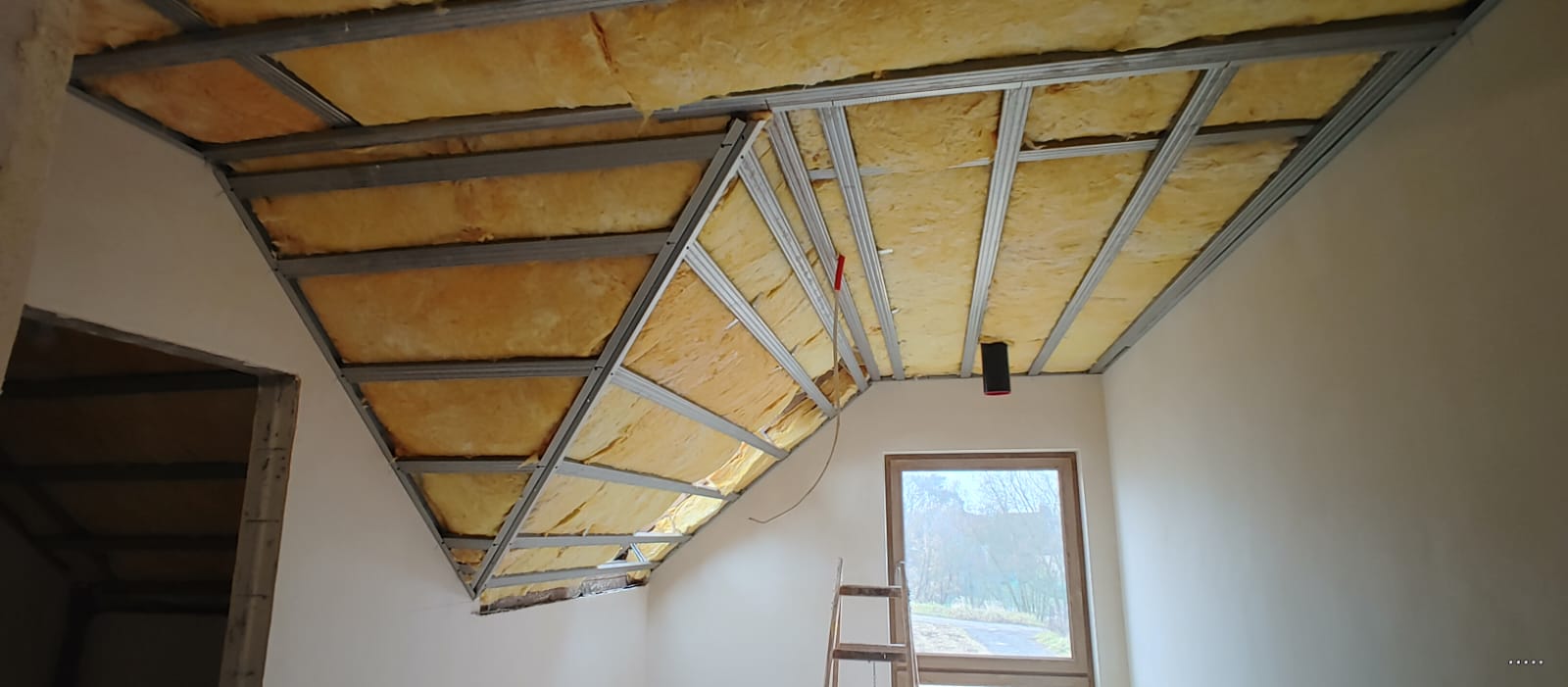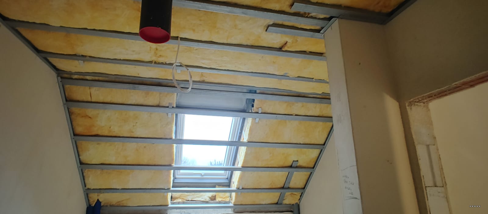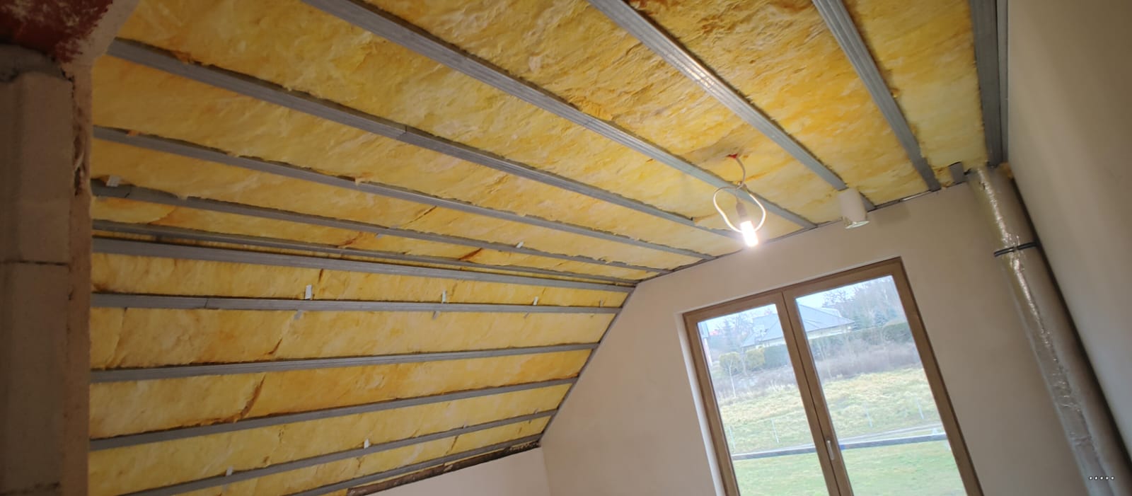 Wykonanie ocieplenia dachu i stropodachu wełną szklaną mineralną Isover Super mata 15 cm w domu jednorodzinnym Bibice / Michałowice / Zielonki